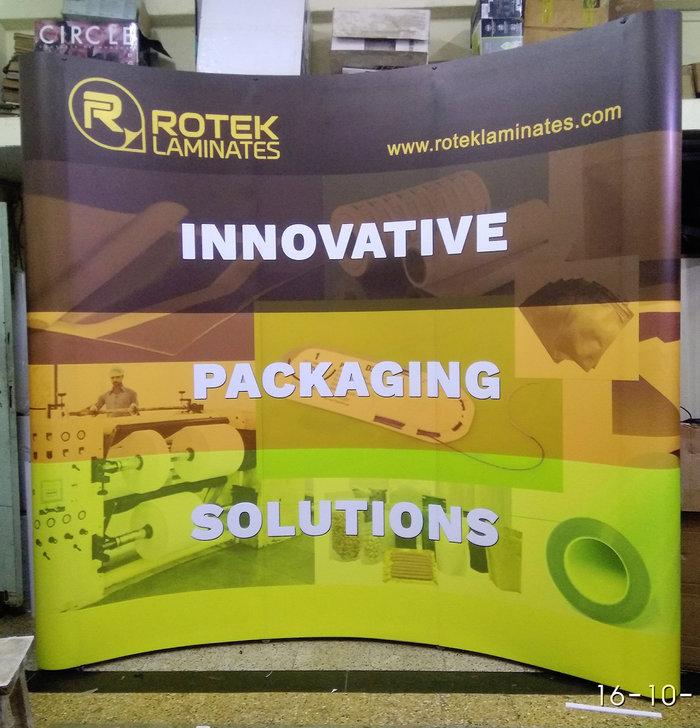 . Flex on Frame Cheapest and non reusable route preferred by many exhibitors who wish to spend minimal on the exhibition stall graphics is using flex fixed to wooden frame work. Looks cheap as well as feels light on pocket but actually, in the long run, it is expensive way of doing things unless you require graphics change for almost all your exhibition needs. 2. Roll Up Banner Stand May be a bit cumbersome to carry but one could use a 240 cm width roll up as a substitute to flex on frame approach at may be same cost and still be reusable for many display needs and exhibitions.Only drawback is portability as 8 feet width would require special arrangements. Another drawback Roll Up banner stands face is general failure due to transportation damage and mishandling.